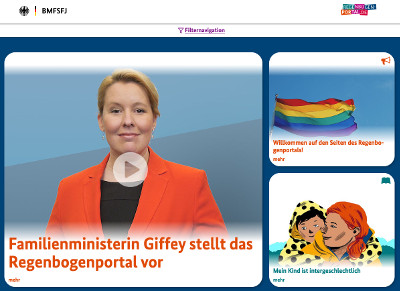 Das Regenbogenportal des Bundesministeriums für Familie, Senioren, Frauen und Jugend (BMFSFJ) soll zentrale Anlaufstelle im Netz für Lesben, Schwule, Bisexuelle, sowie trans- und intergeschlechtliche Personen sein. Aber auch Angehörige von LGBTI, Fachkräfte und alle, die sich informieren wollen, finden hier Texte und Videos zu den verschiedensten Themen im Regenbogen-Spektrum.