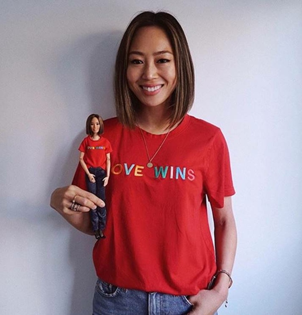 Instagram/ songofstyle"Es war mir superwichtig, dass diese Barbie verkörpert, wer ich bin und woran ich glaube, und natürlich auch, dass sie sich so kleidet wie ich!", schreibt US-Fashionbloggerin Aimee Song, die Modell für die "Love wins"-Barbie standSong, die das "Love Wins"-Shirt selbst entwarf, um ein Zeichen für die LGBT-Community zu setzen, bietet es auf ihrer Webseite (in normalen Größen) an und spendet 50 % des Erlöses an ein LGBT-Projekt, das suizidgefährdeten Jugendlichen hilft.